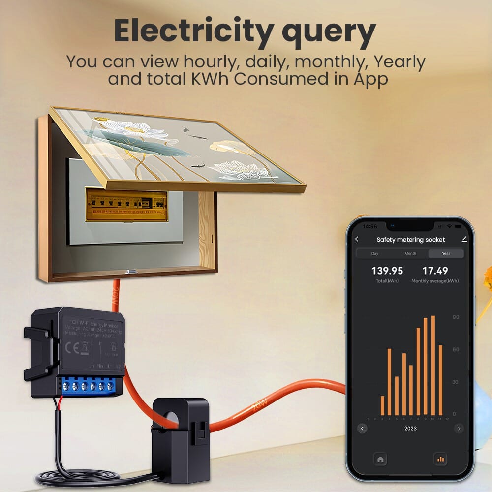 Đồng hồ đo năng lượng thông minh Tuya WiFi này giúp đo lượng năng lượng mà hệ thống năng lượng mặt trời và quang điện đang tạo ra và mức tiêu thụ điện năng bằng ứng dụng giám sát. Được điều khiển bởi Tuya app, ứng dụng hiển thị công suất, dòng điện, điện áp, hệ số công suất và tần số theo thời gian thực cho kênh để chuyển tiếp và đảo ngược. Hỗ trợ tự động cài đặt giá trị van và với thông báo đẩy, và thiết bị có thể được hiệu chỉnh bằng cách điều chỉnh phần trăm.